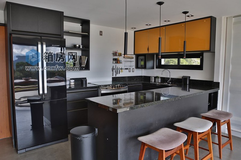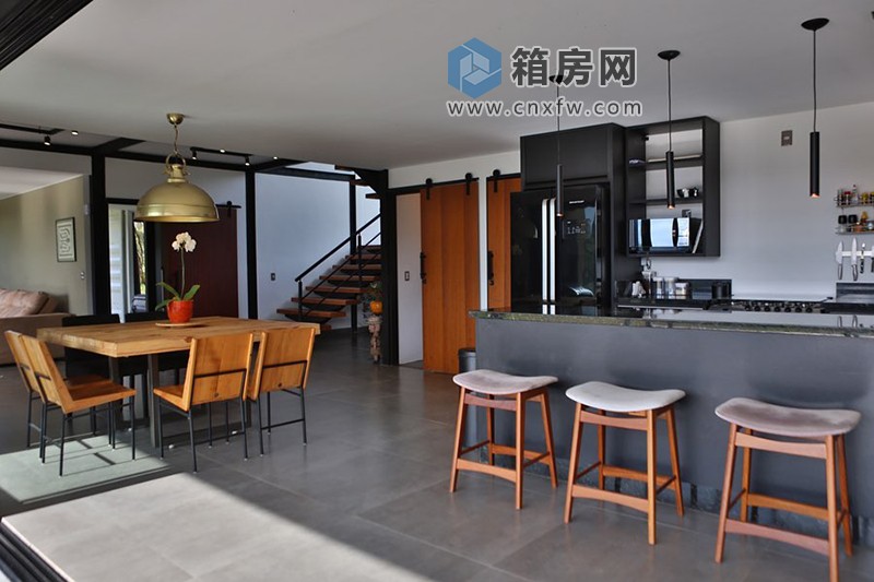 餐廳和廚房位于另一個集裝箱空間內(nèi),主色調(diào)以黑白灰為主,桌椅則另外采用了比較有質(zhì)感的原木,為空間增添一些溫馨。廚房區(qū)域用吧臺圍了起來,箱壁上還有一排切割出來的小窗,讓原本封閉的墻面有了戶外的活力。