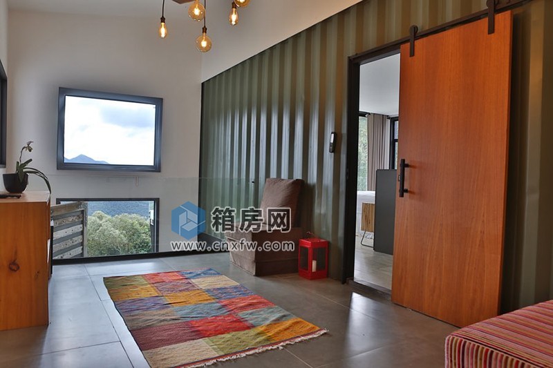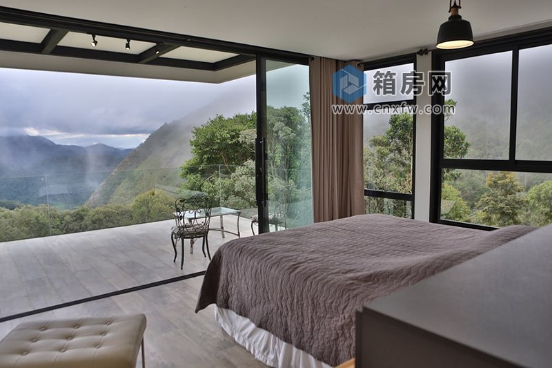 從住宅中部用木塊作踏板的樓梯往上走,可以通往二層的全景臥室。從標志性的波浪板墻壁你就可以感受集裝箱建材的工業(yè)魅力,一種極簡的線條美。整個臥室采用了大面積的落地玻璃窗,戶外還有一個視覺無阻擋的玻璃欄桿陽臺,每天在這片美景中醒來也太“神仙”了吧!