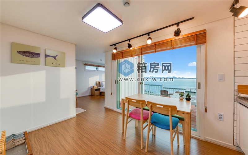 位于一座大宅子的前方,這是一個配套完善的集裝箱房屋。擁有別致的小露臺,能坐擁無敵海景。而且不只是室外露臺,室內(nèi)的落地窗前也同樣能有一覽無余的視覺。