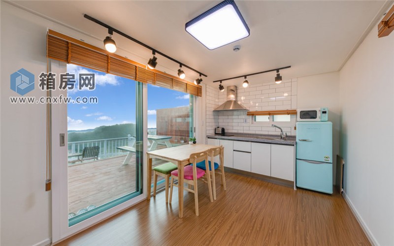 室內(nèi)采用開放式布局,廚房、餐廳和臥室都在同一空間內(nèi),沒有門的阻隔,兩個集裝箱從內(nèi)部打通,這使得空間看起來更寬敞。同時,裝潢也以簡潔和明亮為主,因?yàn)閼敉獾木吧鸵呀?jīng)夠美了。