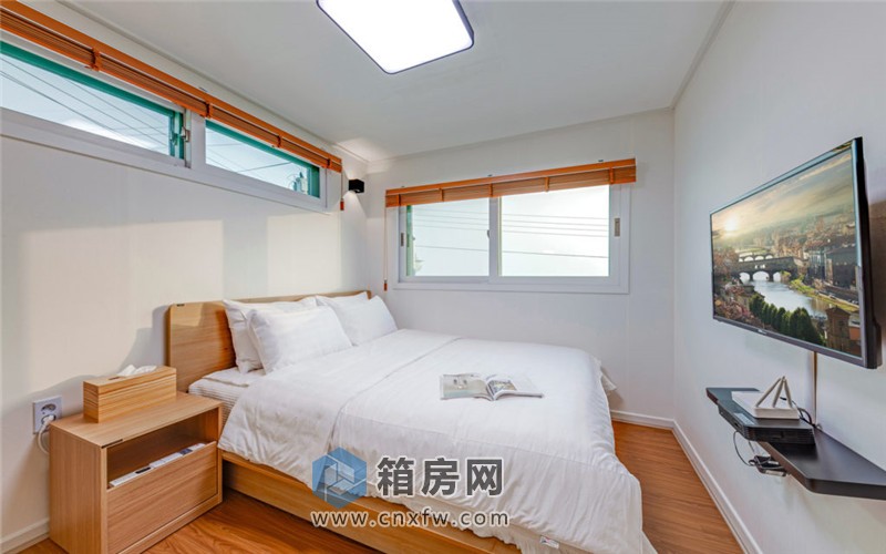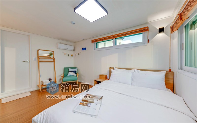 臥室的入口是休憩一角,一張北歐風(fēng)格的沙發(fā)放置在這里,提供了一個看書、放松的角落。旁邊是一張舒適的床,靠墻而設(shè),圍繞在床的上方是兩個用以通風(fēng)和透光的窗戶,一起床便能看到海。整體環(huán)境用木制家具和地板來修飾,以簡約為主,卻營造了溫馨的氛圍。