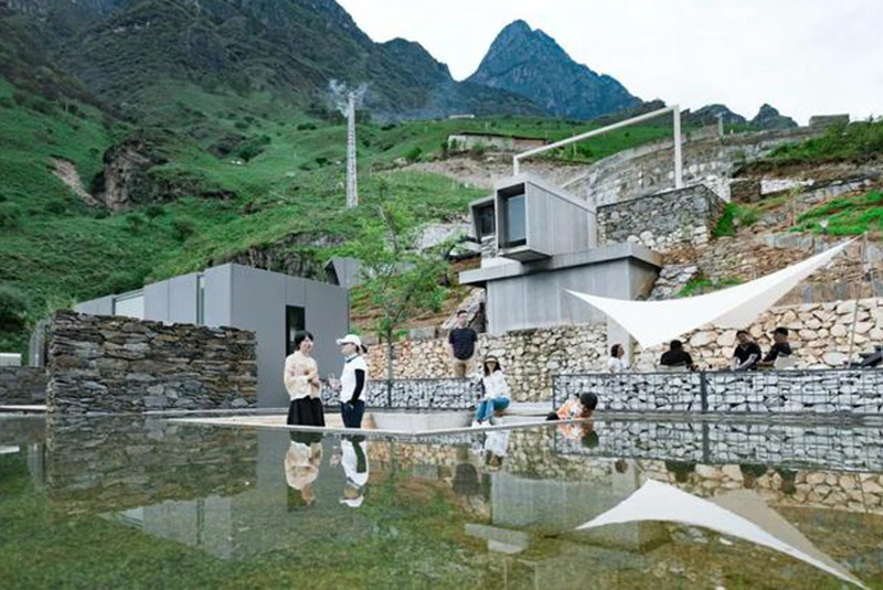 位于云南省香格里拉市的虎跳峽,是世界最深的峽谷之一,長約16公里,上下落差200米。在過去的40年中,這條峽谷的徒步路線,已享譽(yù)全世界。13年前,昆明人王猛帶著未婚妻來到了這里,雖然玩得很開心,但對于一個(gè)沒有任何徒步經(jīng)驗(yàn)的都市女孩來說,她很難適應(yīng)背包客棧的住宿條件,一晚上都沒休息好。當(dāng)時(shí),王猛玩笑地對未婚妻說:“未來,我一定在這里給你造一個(gè)舒服的房子。”2020年8月,王猛如愿帶著太太來到了同樣的地方,住進(jìn)了自己親手造的酒店里。