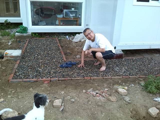 在牛大叔的努力之下,壘地板基和修小路播種,還有掛花、掛架組裝完成后,牛大叔開始了他的集裝箱裝修之旅。集裝箱邊上的小路,全部是裝修廢棄的碎料,省時省力又省錢,并且牛大叔還在一旁加入了一些舊磚頭和安全王。