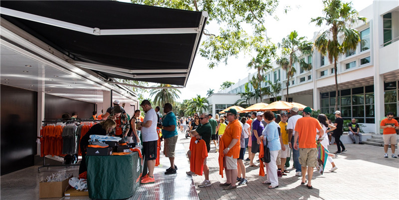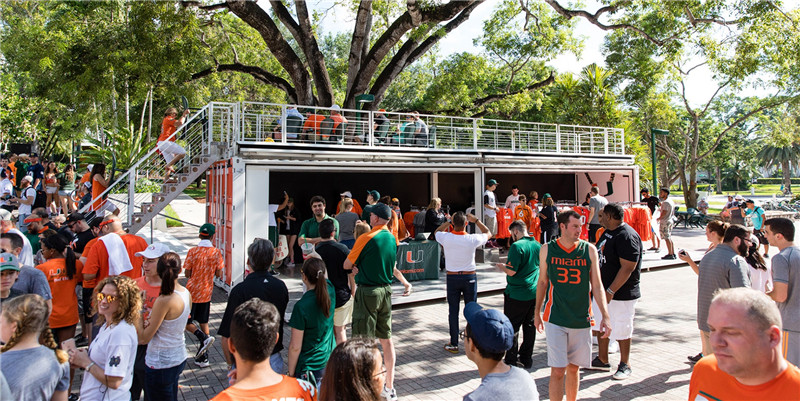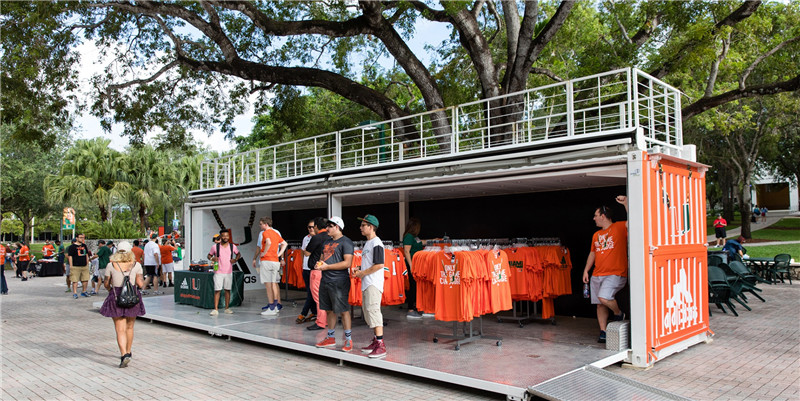 改造后的集裝箱主要用于展示和銷售阿迪達斯與邁阿密大學的聯名服裝,建筑外殼使用了和服裝一樣的主打色——代表活力的鮮橙色,并繪有標志著比賽精神和力量的“金色周轉鏈”。建筑的內墻上設有簽名墻,學生和球迷可以在比賽前寫下個人信息和鼓勵的話語來向他們的團隊表示支持,這為比賽提供了一項互動活動。