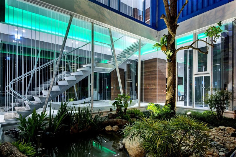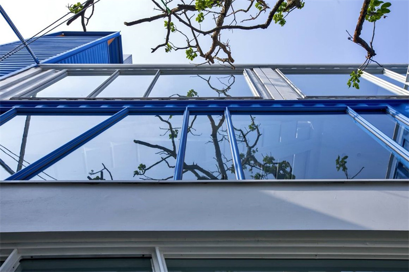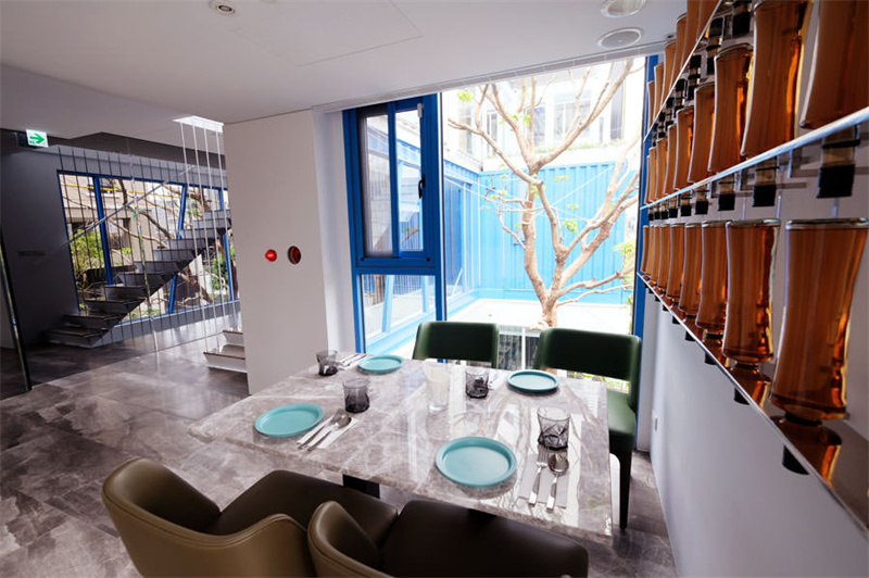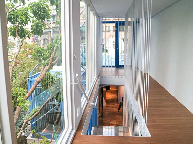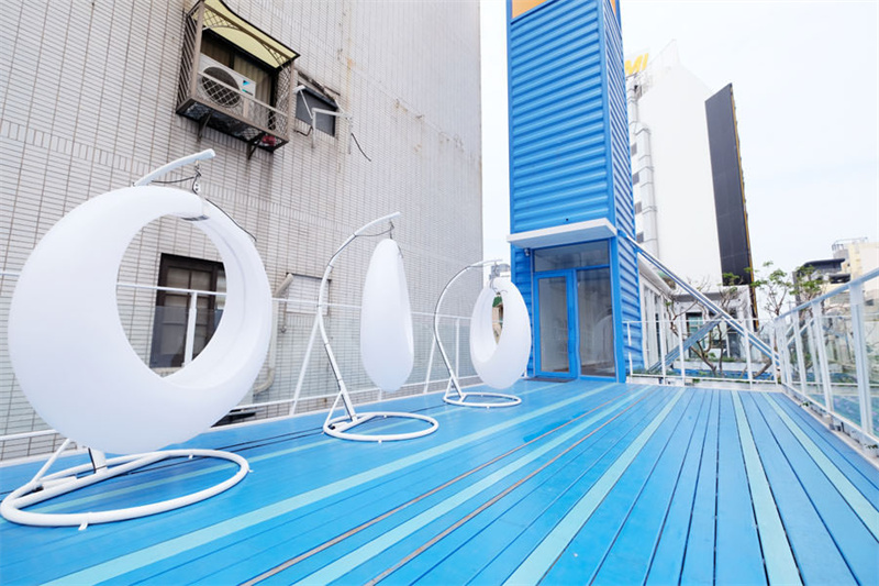 看到如此熟悉的紋路,就應(yīng)該知道這又是一家集裝箱改造而成的三層建筑了。然而事實是建筑的外表僅以集裝箱鐵皮作為裝飾,實則為鋼骨結(jié)構(gòu)。外觀以藍(lán)白為主,形似一艘大船停泊在路邊。