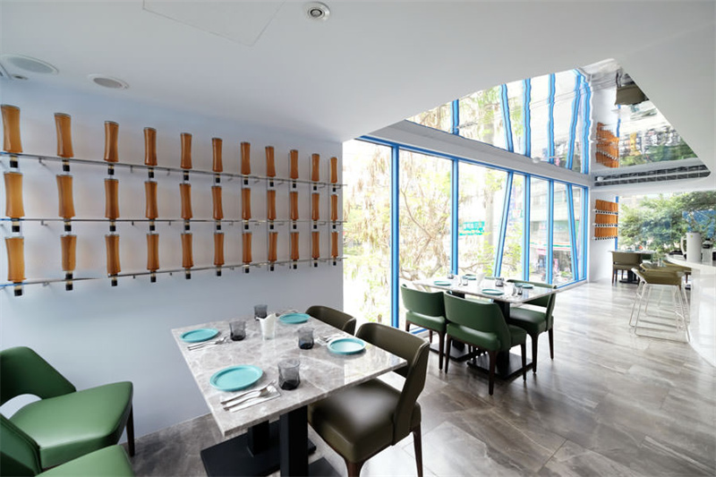 負(fù)責(zé)設(shè)計該餐廳的設(shè)計師表示,該土地寬6公尺、長約37公尺,面積不大且呈現(xiàn)狹長型,周圍皆為新大樓,有許多花園景觀。因此該餐廳采用了大量玻璃,引光納景,增強穿透性。