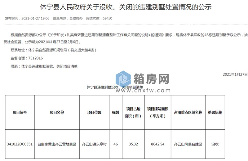 據安徽省黃山市休寧縣政府網站消息,休寧縣政府發(fā)布《休寧縣人民政府關于沒收、關閉的違建別墅處置情況的公示》稱,根據自然資源部辦公廳《關于印發(fā)<扎實有效推進違建別墅清查整治工作有關問題的說明>的通知》要求,將休寧縣沒收的46棟違建別墅予以公示,接受社會監(jiān)督,公示期為2021年1月27日至2月6日。公示附件顯示,休寧縣這46棟違建別墅位于齊云山鎮(zhèn)東亭村,項目名稱為祥源自由家黃山齊云營地景區(qū)。