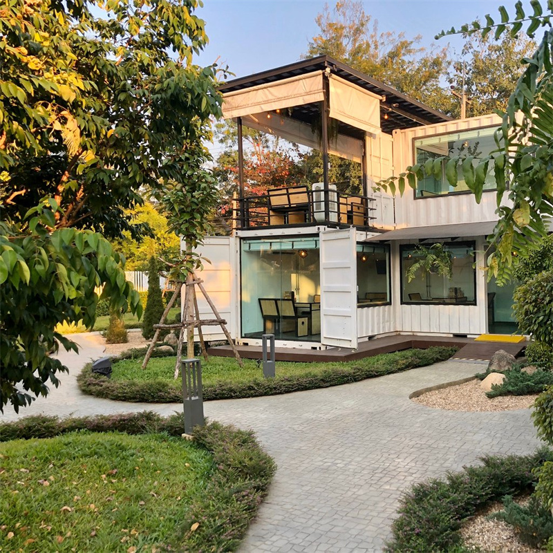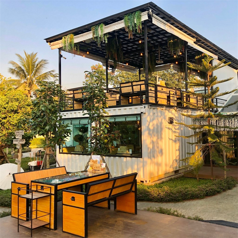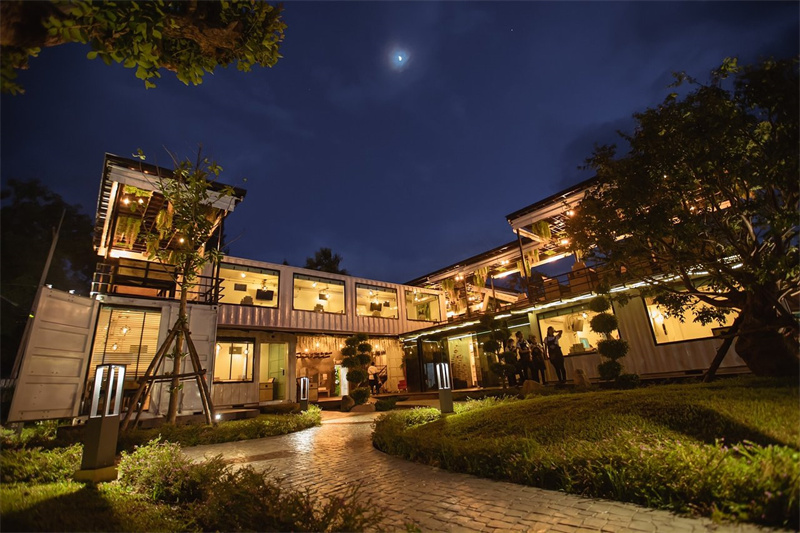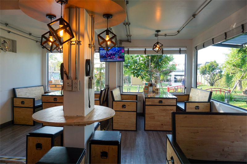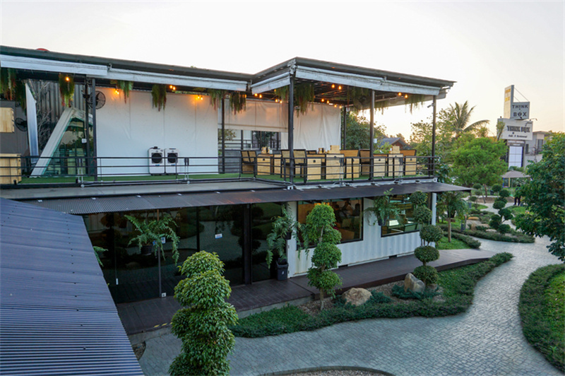 餐廳內部空間由兩個或者多個集裝箱打通使用,形成了寬敞的活動空間。建筑內擁有會議室和研討室等多種空間布局,大小的房間為顧客提供各種活動場地,包括戶外草坪為尋找婚禮場地的人提供了一個優(yōu)美的環(huán)境,私人英式花園是浪漫的場地。