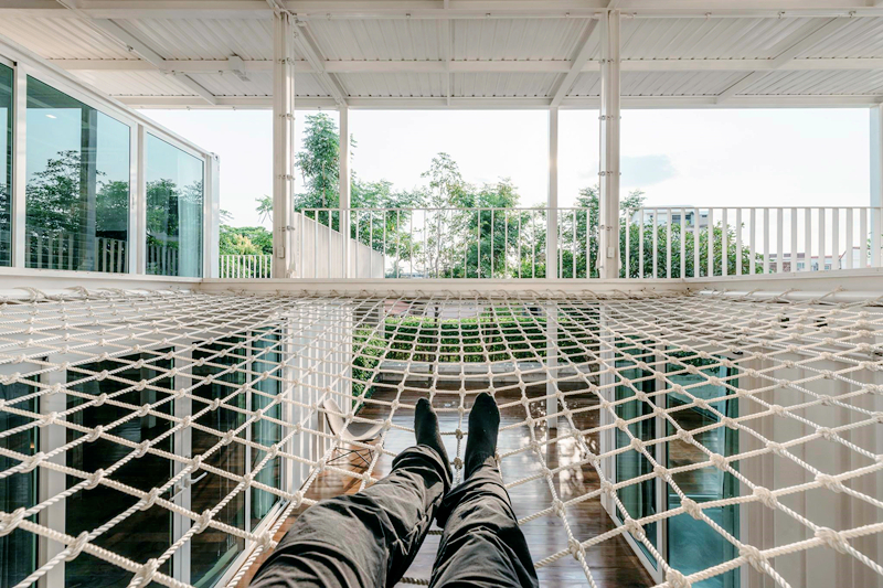 房子還有一個有趣的網狀天窗設計,這樣既可以保證一層走廊的透光性,又為生活增添了一點休閑的樂趣。想要放松的時候隨便一趟就是整個房子專設給你的“搖籃”。