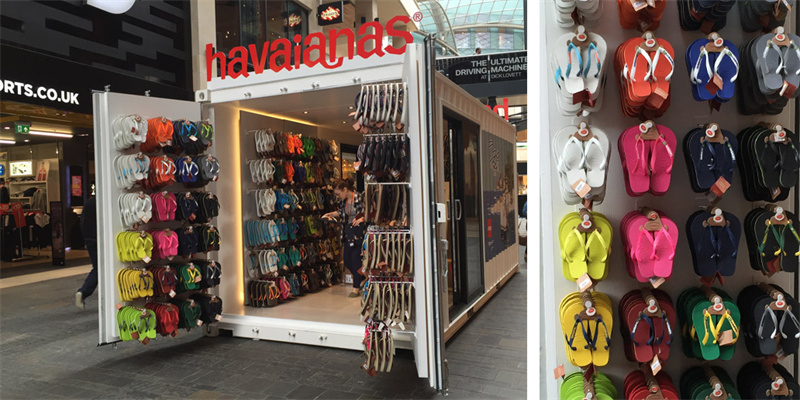 當紅的Havaianas哈瓦牌人字拖打入了巴西的國內市場,無論是室內專賣店,還是快閃店,都采用集裝箱打造全新店面風格。哈瓦那人字拖之所以能成為明星型人的首選,是因為其款式多多,層出不窮。用來搭配牛仔褲,工裝褲,T恤,裙子熱褲等等,都是時尚潮人必備的休閑選擇。