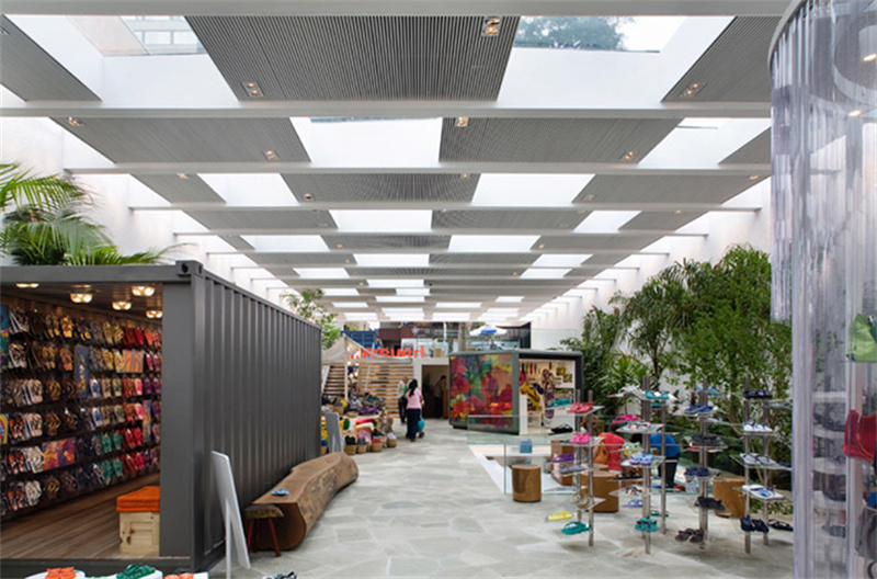 大型店面內,設計了不同風格的商品展示區,其中也運用到了海運集裝箱元素。店中有店的空間設計,跟隨陽光的明暗變化,更大地增強了室內海灘的真實感。