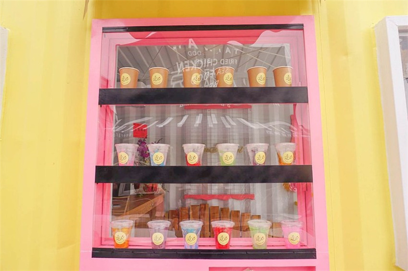 【走心cafe】是市集里面的一家咖啡店,黃色為主體色調搭配上粉紅色的咖啡售賣機,鋪面而來的小清新風格吸引著游客的眼球。