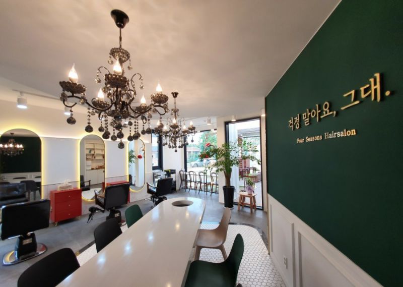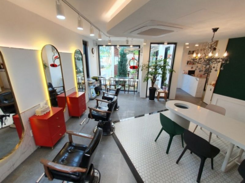 進(jìn)入美容院室內(nèi),內(nèi)部環(huán)境就和外觀一樣整潔和清新。工作區(qū)內(nèi)放置沙龍椅、鏡子和工作柜等,配套齊全的美容美發(fā)工具。白、綠搭配的裝潢色調(diào)營造了高級奢華的氛圍感,并在天花板安裝水晶吊燈點綴。