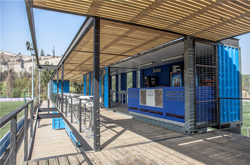 一個獨特的集裝箱建筑,能夠為這個城市提供一個休閑大氣的生活形象,反過來又與商業環境的復雜和發展方式形成對照。集裝箱是一種貨物裝載工具,現在用于體育休閑空間,這家體育場為了讓人們有更好的觀賽體驗,建立了一個以集裝箱為主體的球場觀賽區域。每一個集裝箱都在工廠內完場打磨、上漆,樓梯與鋼結構都是現場搭建,與集裝箱完美的結合在一起。