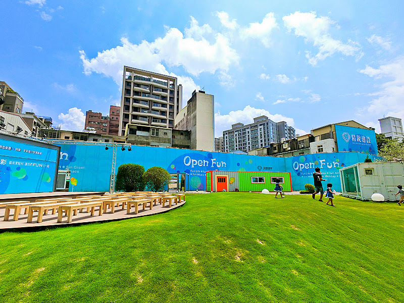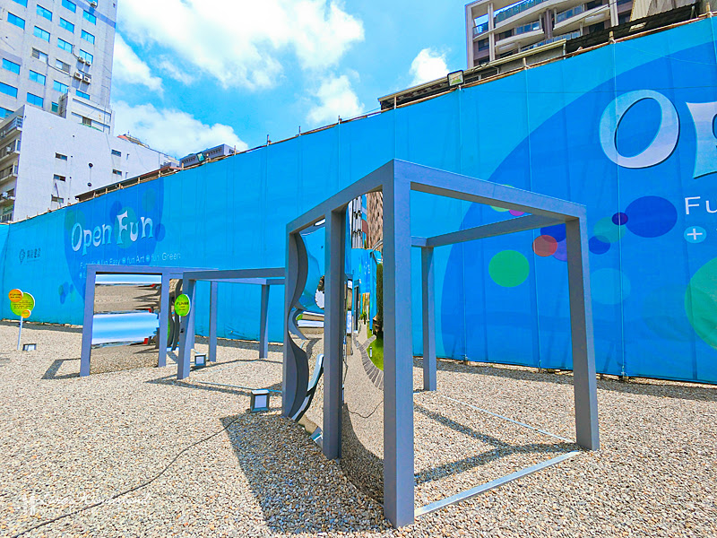 繼續往前走是一個色彩鮮艷的集裝箱和一堆鐵框,鐵框內鑲嵌上一些反光的材料,將鋼鐵元素玩出無限可能。再過來是一個“鏡子箱”,它們的前方剛好圍成一個露天舞臺,用于舉辦各種不同的藝術活動,一個大草坪實在太適合戶外玩耍了。