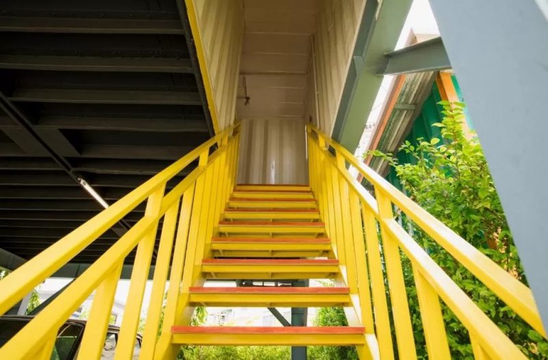 每棟集裝箱建筑的結(jié)構(gòu)都相似,由鋼架構(gòu)把兩個(gè)集裝箱模塊架在上方,下方的架空層形成了天然的停車庫,為自駕的游客提供便利。不同的建筑由不同的顏色標(biāo)識(shí),進(jìn)入房間的樓梯就建設(shè)在車庫旁。