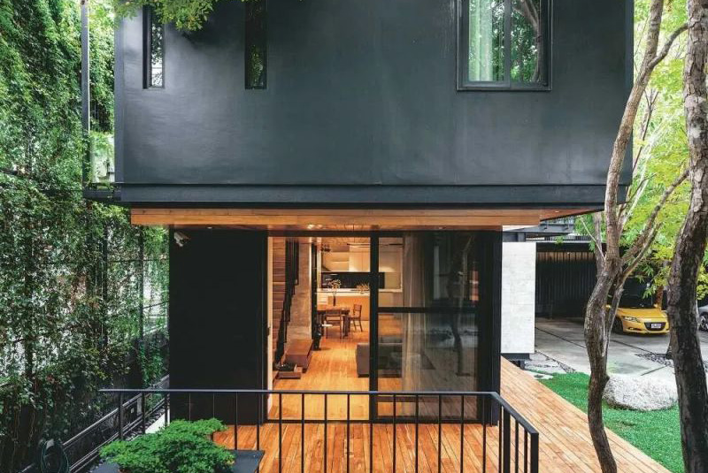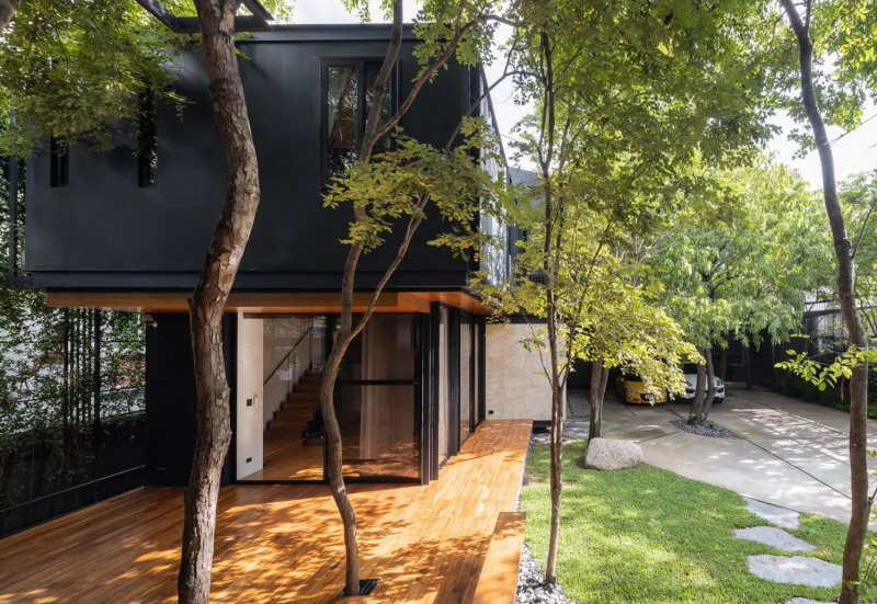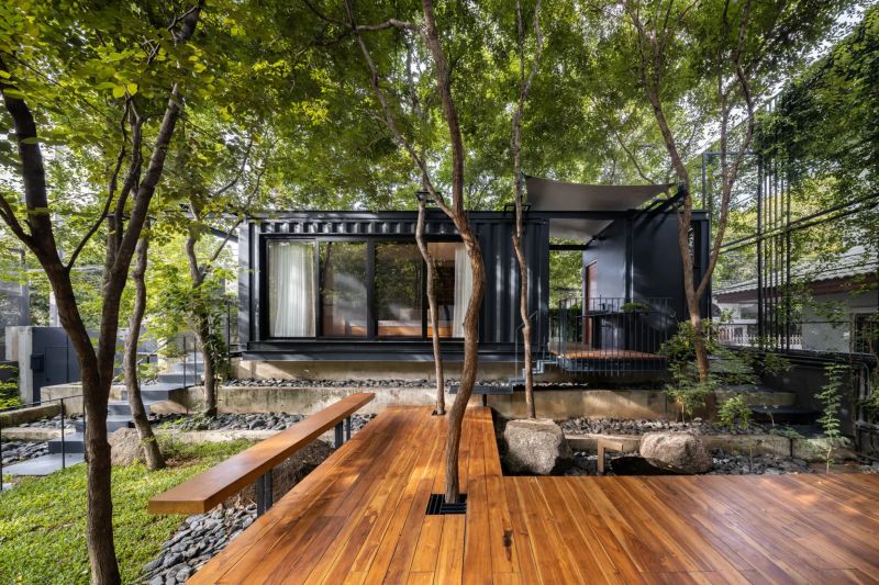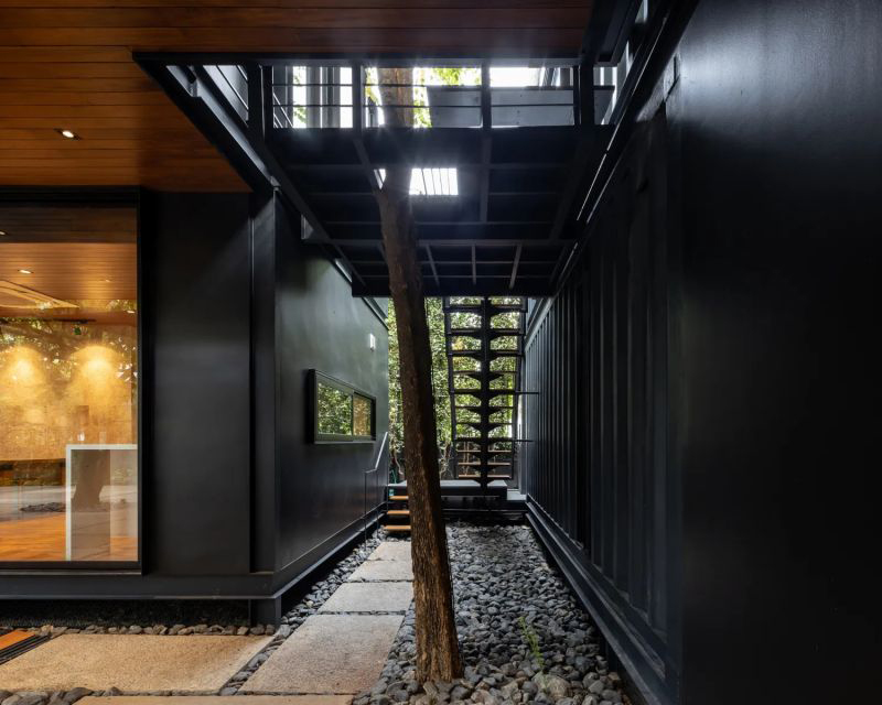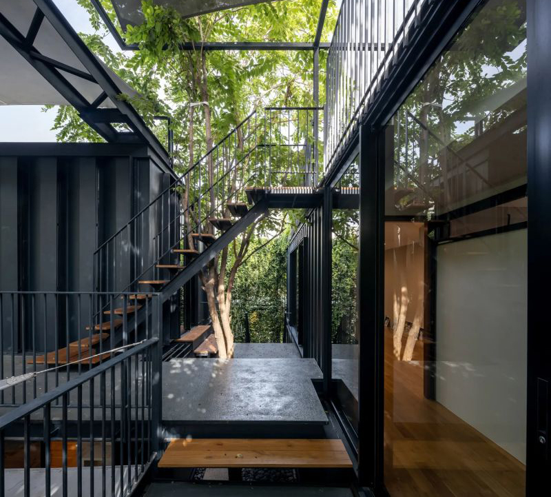在郁郁蔥蔥的寧靜和平氣氛中,這座房子卻位于繁華的城市中心。房屋本身的特點是使用黑色的集裝箱模塊作為房屋和工作室。房屋的入口擁有柚木地板、混凝土板、帶有大礫石嵌件的花園人行道等,將花園與房屋的樓梯相連。花園里的車庫屋頂上有一個洞,可以讓樹木穿過二樓生長,同時起到支撐的作用。