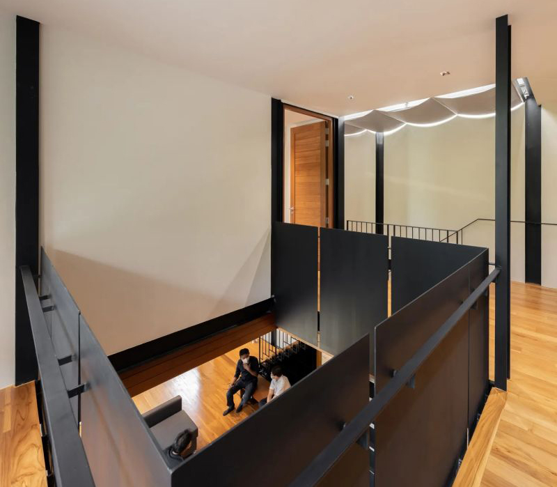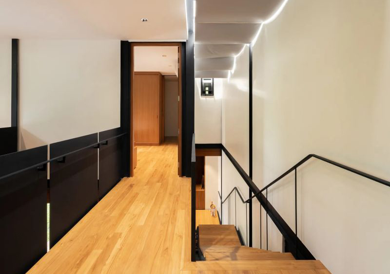 樓梯下的鋼制儲物架創(chuàng)造了額外的存儲空間,作為欄桿的鋼筋,它是木材與金屬的完美結(jié)合。二樓樓梯的頂部是一個天窗,在晴朗的日子可以露出天空,與樹木和諧相處;在不需要的時候則可以拉上窗簾,保持陰涼。