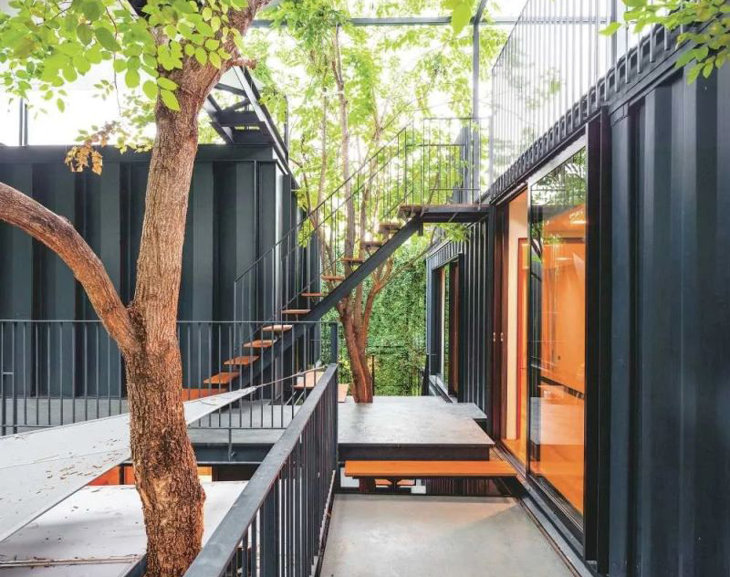 房屋的入口由一條從地面上升起的坡道形成,在柵欄的前面可以看到一個集裝箱亭子,里面有一個花園,連接著兩層樓的房子,是一個熱帶庭院中的集裝箱房子。集裝箱房屋的前部設(shè)計是高出地面的設(shè)計,各個生活功能區(qū)域的劃分明確,僅由前廊相互連接。