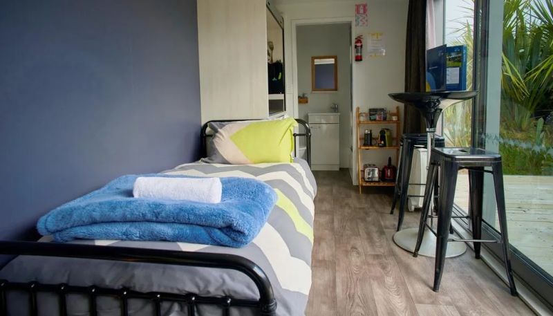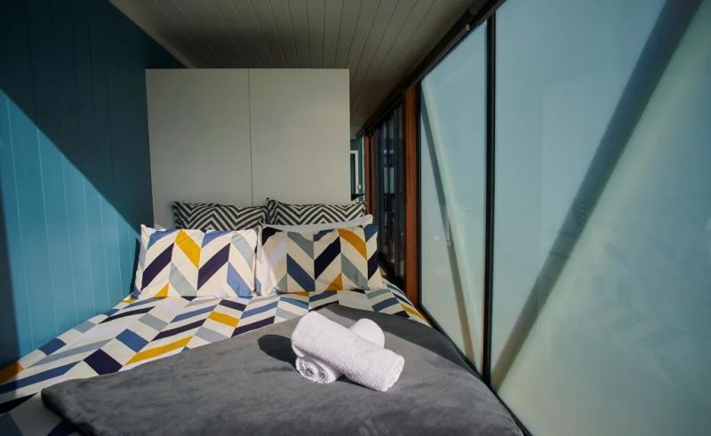房屋的另一邊是一柜之隔的臥室,一張舒適的雙人床靠墻而設(shè),全透玻璃窗擁有磨砂窗簾,在需要私密環(huán)境的時(shí)候便可以打開使用。房屋內(nèi)的軟裝材料都挑選了令人舒適的材質(zhì)和色調(diào),布置溫馨,讓住戶可以真正享受休息。