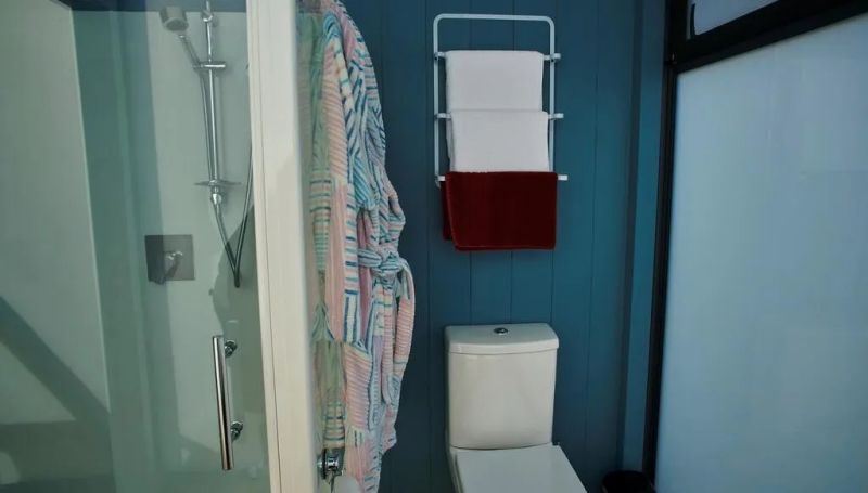 衛(wèi)浴間設(shè)置在該集裝箱的一個(gè)末端位置,小巧的空間內(nèi)擁有獨(dú)立的浴室,用玻璃立板圍起。一旁磨砂的玻璃窗既能透光又能保持私密性,打造了節(jié)能的生活場所。
