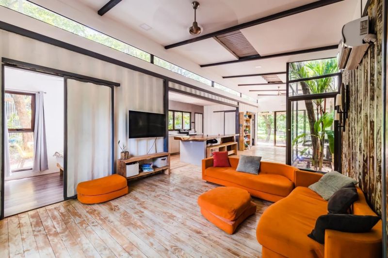 這座美麗的集裝箱房屋建設在4000平方米的土地上,房屋周圍環繞著一條60平方米(645平方英尺)的游廊,鋪設干爽的原木地板,放置簡易的餐桌椅,住戶可以在此放松身心,享受愉快的寧靜時光。