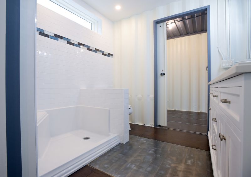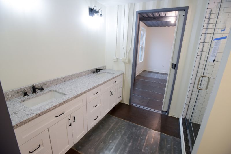 衛浴室的設計十分明亮且寬敞,連洗漱臺都擁有并排的兩個,同時全白的色調為空間帶來整潔的視覺感。進入浴間,你可以全方位感受到集裝箱內部的結構,墻面鋪設的瓷磚則可以有效防潮。