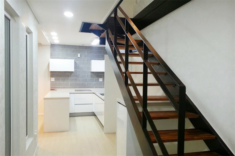底層的空間主要用作客廳、廚房和衛生間等,布局緊湊,風格簡約。如果想要到二層的臥室就要從廚房邊上的樓梯上去,設計比較窄小,有利于節省空間,底下還能放冰箱什么的。