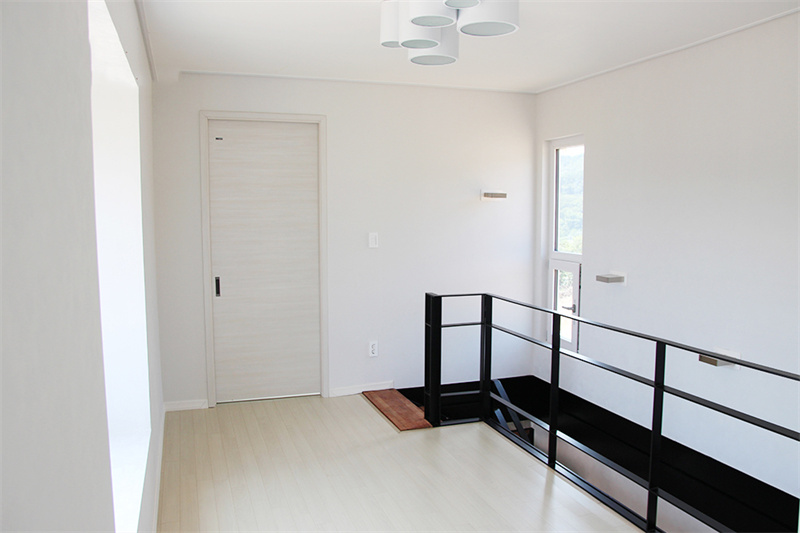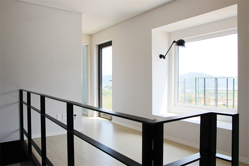 到了二層,是一個擁有多窗的環境,因此這里十分明亮。你可以看到走廊上有一扇窗戶往外凸,形成一個可以靠窗坐著的空間,上面還特地安裝了一盞燈。其實這是故意的設計,為此還多改造了一塊集裝箱壁。而門外便是陽臺。