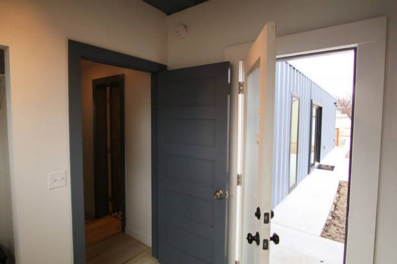 這是一所由三個集裝箱建造而成的私人住所,坐落于草坪上的它擁有木柵欄圍起的小庭院、小徑和小露臺。房屋的主要入口是一扇全景的玻璃門,大面積的采光為室內創(chuàng)造了明亮寬敞的環(huán)境。廚房內的主要家電和櫥柜已經配備齊全,這些都是在工廠預設好了,搬運到當地組裝后便可以直接使用。