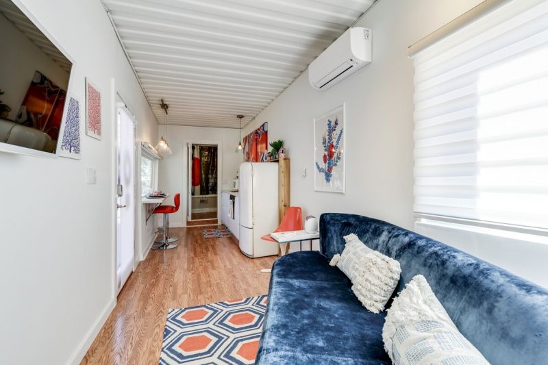 縱觀集裝箱房的整體,我們可以看到白色和木質(zhì)兩者簡單完美的和諧。以一定角度切割的玻璃為房子增添了一種獨(dú)特的美,還能為室內(nèi)空間帶來自然光線。這所房子的內(nèi)部裝修十分簡單,但也和外觀一樣時尚,客廳中部放置的天鵝絨的藍(lán)色沙發(fā)提高了不少品質(zhì)和格調(diào)。