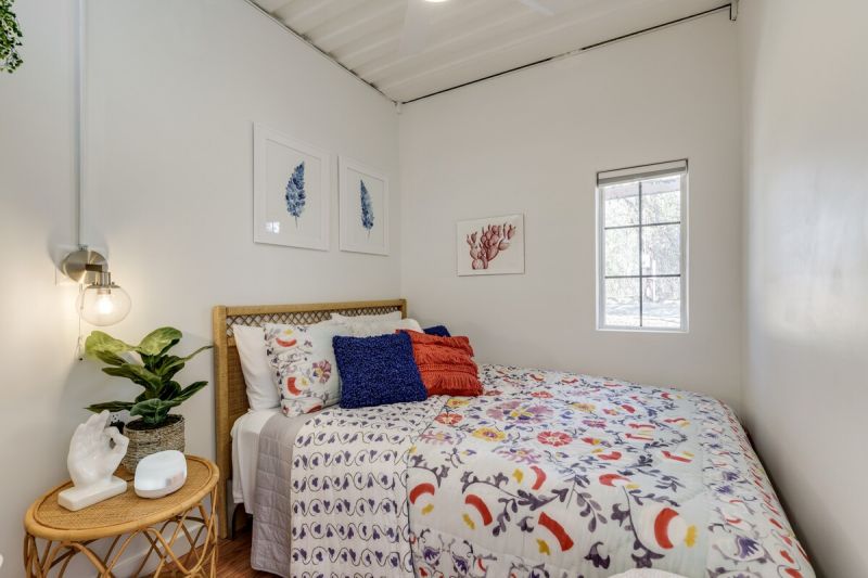天鵝絨藍(lán)色沙發(fā)的后面有一扇隔板,將箱內(nèi)空間間隔了一個小小的睡房。睡床的位置剛好可以嵌套在集裝箱的末端空間里,床邊的一扇小窗創(chuàng)造了流通空氣的條件,躺在床上就能欣賞到天花的工業(yè)風(fēng)波浪板。