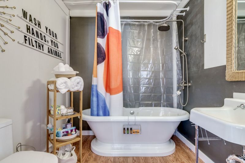 衛(wèi)浴間則設(shè)置在廚房旁的獨(dú)立空間內(nèi),一扇小小的玻璃門阻隔了干燥和濕潤的兩個不同環(huán)境。雖然衛(wèi)浴間的空間不大,但依然設(shè)置了一個豪華的獨(dú)立浴缸,浴簾可以防止水濺出,慎防地面濕潤滑倒。