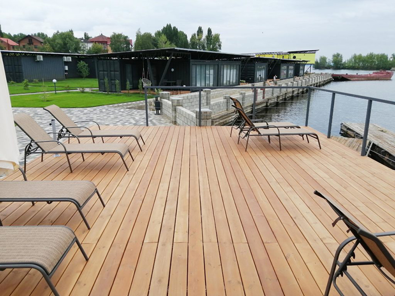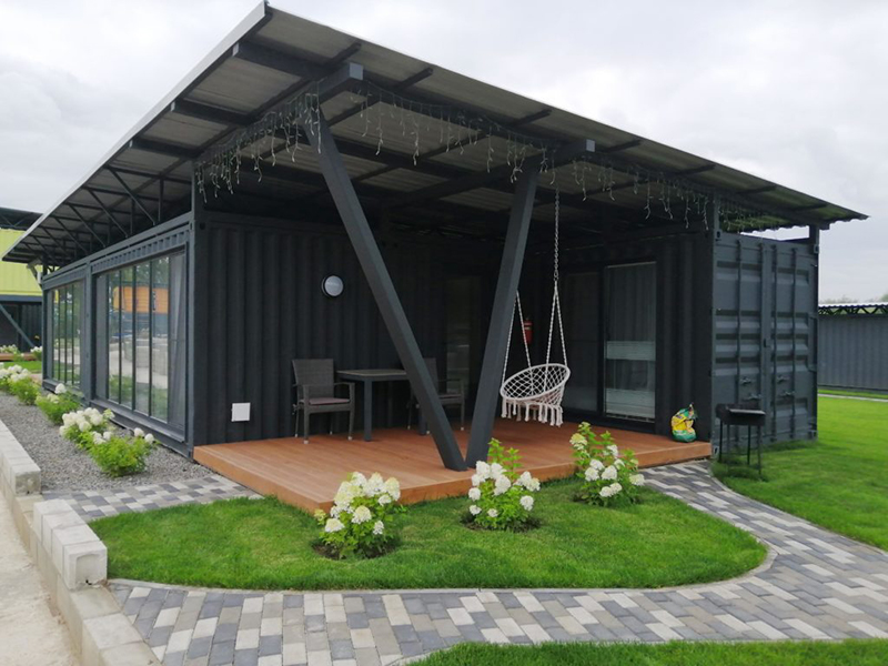 懸臂的集裝箱下方為民宿創(chuàng)造了一個環(huán)境舒適的前庭,地面用木板鋪設(shè),可以懸掛吊椅和放置休閑的茶幾。底層向后突出的集裝箱則為民宿增設(shè)了一個高層露天陽臺,地面同樣由木板鋪設(shè),可以眺望遠(yuǎn)處的景色。