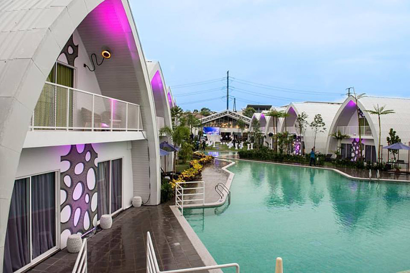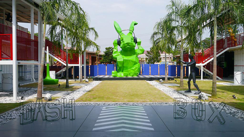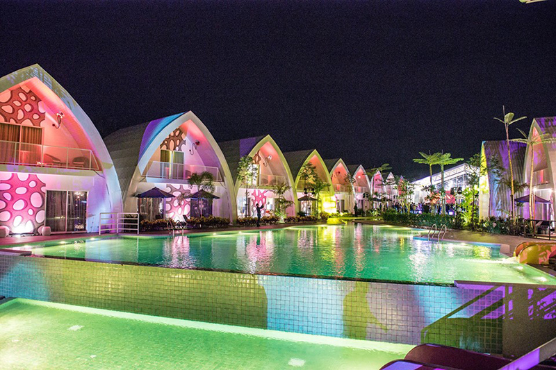 這個(gè)酒店的占地面積很大,還有自己的品牌特色。一直巨大的綠色聽歌兔子就是他們的標(biāo)志,離不開高新科技的光環(huán)——電子音樂設(shè)備。而這里就是標(biāo)準(zhǔn)的度假區(qū)呀!