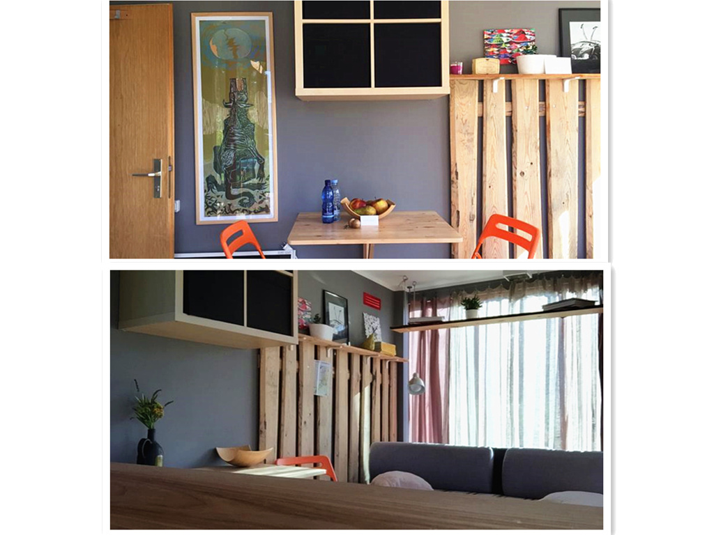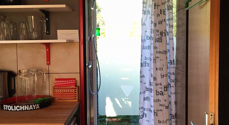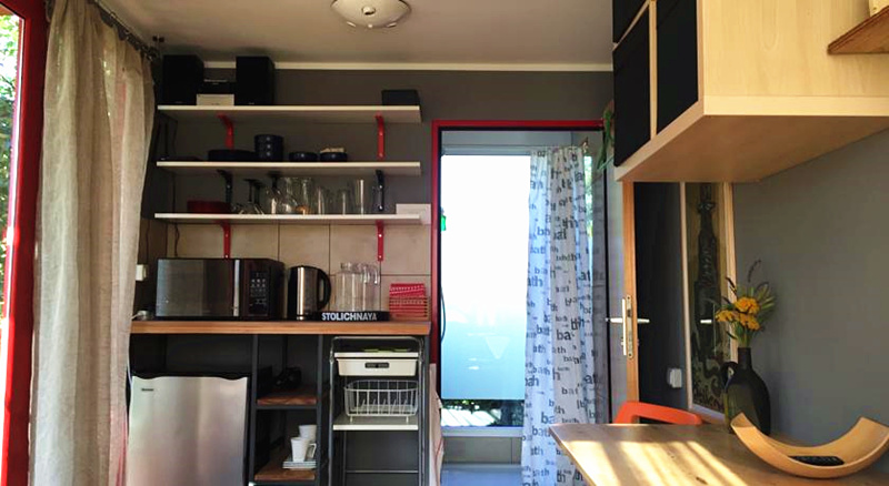 休息室位于房屋入門的右側(cè),沙發(fā)床放置在窗邊,陽(yáng)光透過(guò)窗簾照射進(jìn)來(lái),為原本狹小封閉的空間提供了良好的采光,溫暖舒適。門口左側(cè)的置物柜放置了微波爐、水壺以及各種餐具,旁邊還擺放了木制的桌椅可供使用,客人可以在此就餐。私人淋浴室位于置物柜隔墻的背后,浴室衛(wèi)生間一應(yīng)俱全。