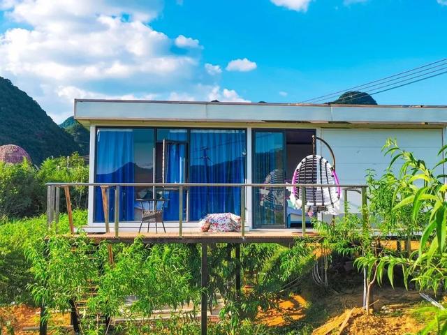 7套柜族民宿,200畝果樹環(huán)繞,由集裝箱、大片玻璃組合看著像木屋,其實更像心中的一座座桃花源。