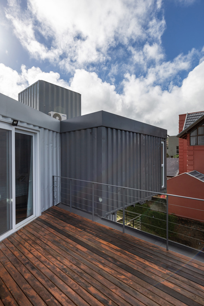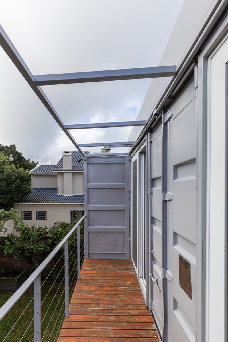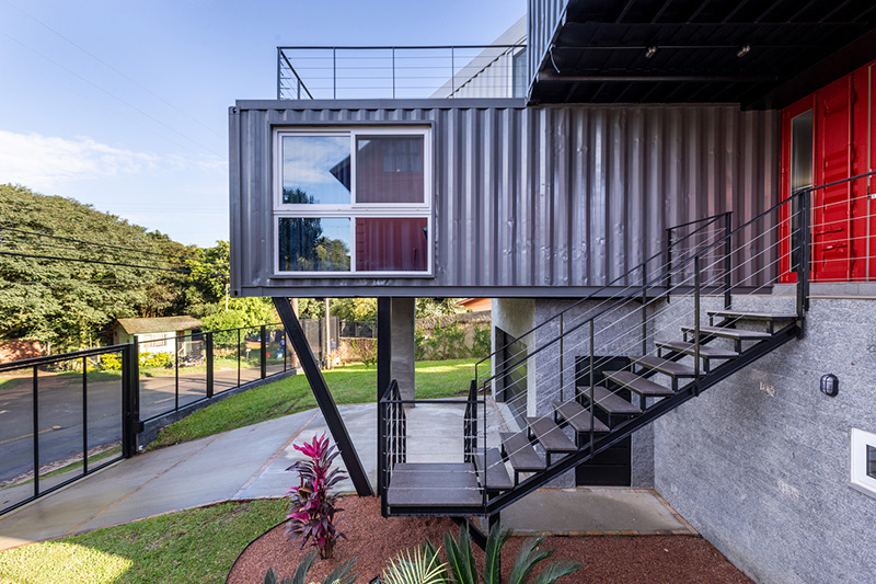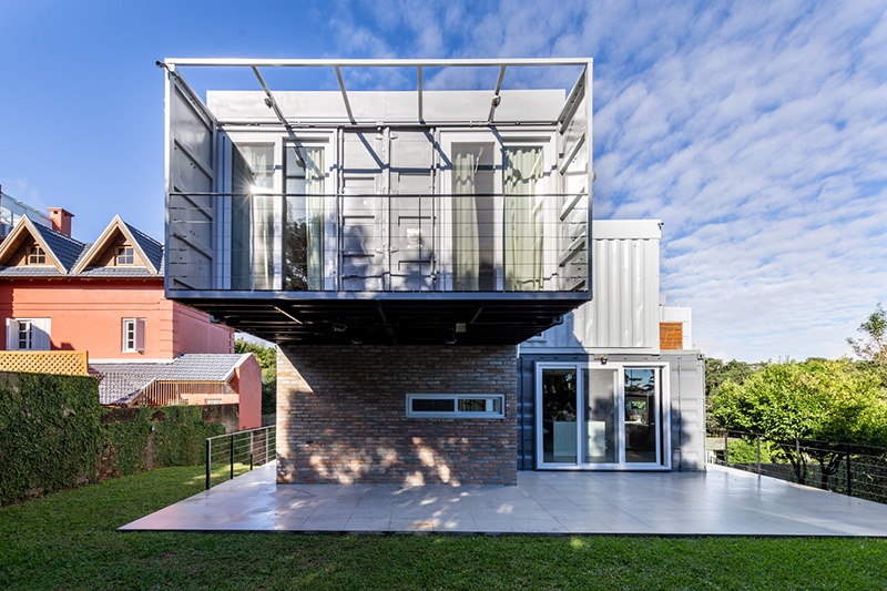 這個(gè)遠(yuǎn)看就像通過(guò)旋轉(zhuǎn)軌跡才能得到的結(jié)構(gòu)其實(shí)是建設(shè)在混凝土地基之上的集裝箱,一個(gè)陡峭的斜坡為這所房子提供了一個(gè)半層樓的空間,就是紅磚搭建而成的車庫(kù)。