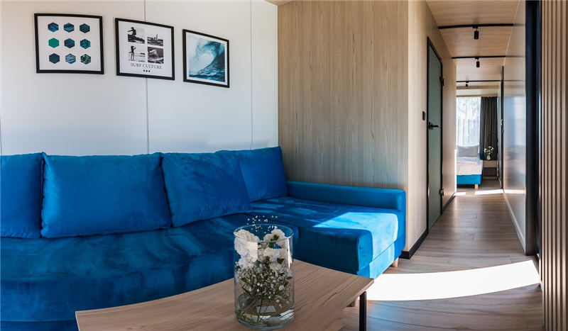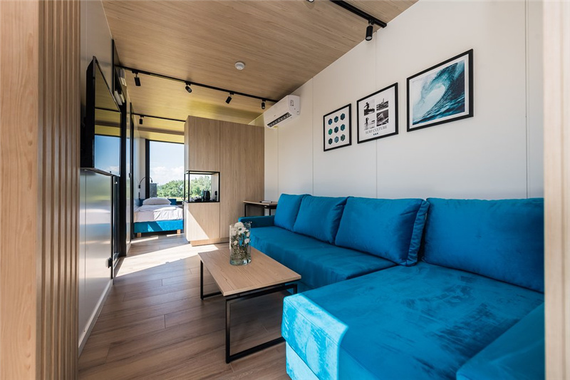 所有的居住空間都集成在集裝箱內,每座獨立的集裝箱建筑都擁有上下兩個單元,每個空調房間都可容納2至6人,同時,每個套房都擁有一個起居空間、一個睡房以及一間浴室。酒店區由接待亭、帶酒吧的海灘、游樂場、排球場等共同構成生活娛樂環境。