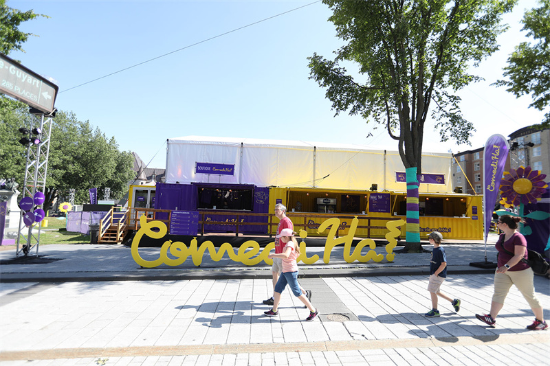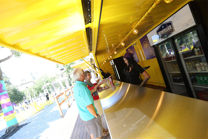 集裝箱被涂上了節(jié)日的專屬顏色——黃色和紫色交替出現(xiàn),門前豎有節(jié)日的雕塑牌。你會(huì)發(fā)現(xiàn)一些集裝箱被“挖”了一個(gè)售賣窗口,這其實(shí)是影院墻壁的多用。整體來看集裝箱是作為影院的一面圍墻,但細(xì)看它卻是一個(gè)個(gè)獨(dú)立的集裝箱商店。