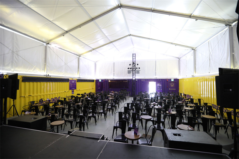 至于影院內(nèi)就是一個(gè)典型的“大棚”,你可以根據(jù)影院所需場(chǎng)地的大小增減集裝箱圍墻,成型之后搭建舞臺(tái)和燈光,再擺上椅子便是一個(gè)功能齊全的影劇院了。