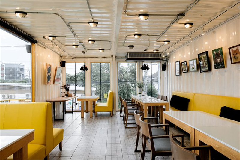 今天介紹的這個項目是用集裝箱打造的創(chuàng)意餐廳,該項目將原始的集裝箱模塊改成看起來更出色的黑色和黃色配色方案。進入一樓,內部采用白色調裝飾,使眼睛看起來舒適,并通過可愛的圖片增添了趣味。
