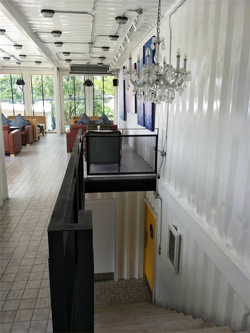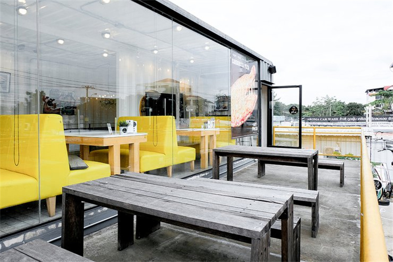 集裝箱拼接而成的內部均被打通,就餐座位分布在空間的每一個角落,靠近全景玻璃窗的卡座享有戶外美麗的景象。從樓梯通往建筑的二層,二樓擁有許多亮黃色的沙發(fā)卡座,天花板上的照明燈工業(yè)風十足。