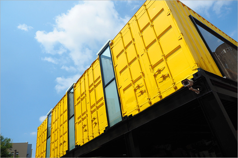 踏進園區,一座明亮耀眼的黃色集裝箱群引入眼簾。集裝箱立面分別被切割或者鑲上玻璃門窗,窗戶上貼上了各式各樣的圖案,這樣一來既保證了建筑內部的通風和透光性,也美化了建筑外觀。