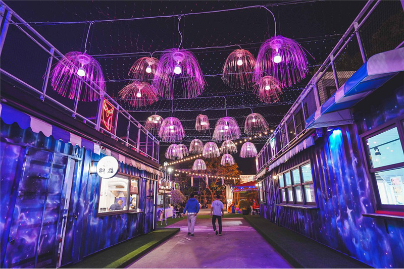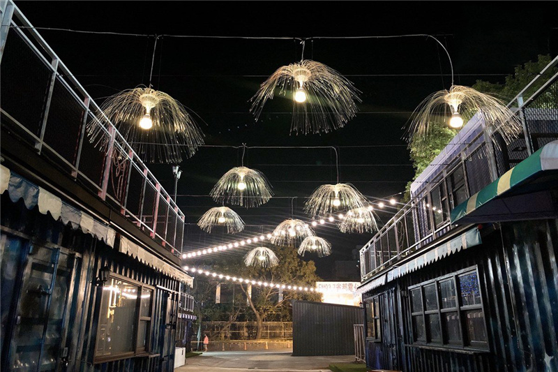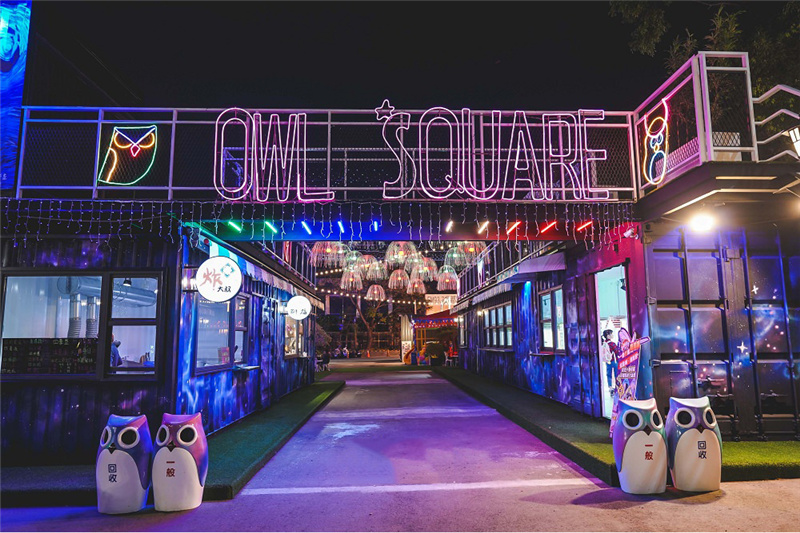 這個貓頭鷹廣場是由多個集裝箱組成的,一樓有餐飲品牌進(jìn)駐,包括披薩、炸雞等,二樓是酒館。在集裝箱街道里走過,抬頭會看見許多水母LED燈被吊在箱頂,不停地更換顏色,炫酷又極具創(chuàng)意!