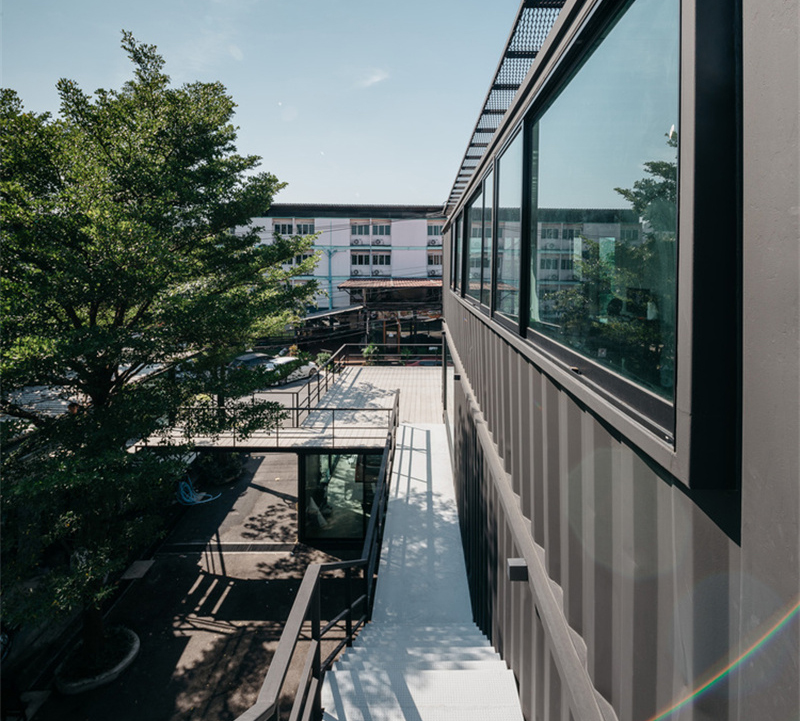 二樓是一個寬敞的平臺上加建一座獨棟,集裝箱從內(nèi)部打通,計劃設(shè)置一家休閑的餐廳,再劃分一個區(qū)域作為酒吧使用。建筑外部采用啞光黑色涂漆,但內(nèi)部為白色,因為兩種顏色可以產(chǎn)生不同的感知。