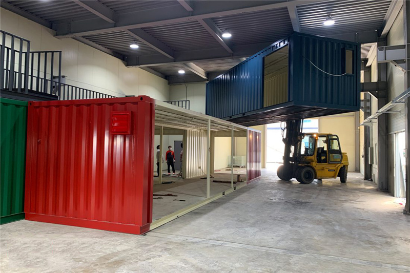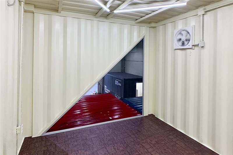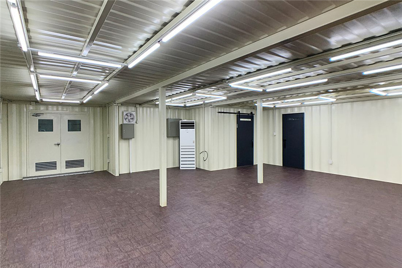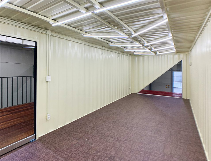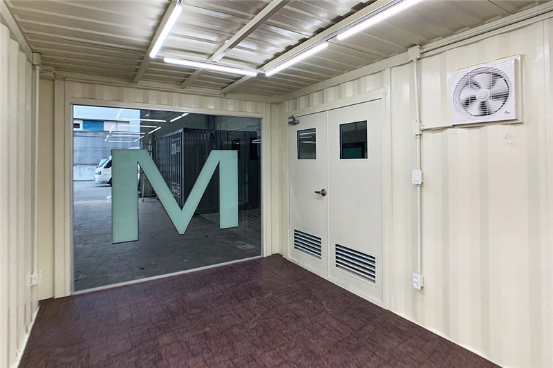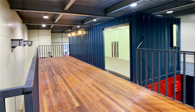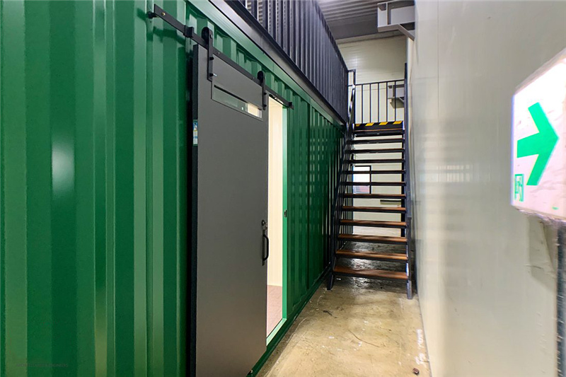 該集裝箱模塊是非絕緣材料,外墻飾面經(jīng)過防銹處理,并覆蓋指定彩色油漆,屋頂平臺鋪設(shè)有天然的木甲板。箱身上開設(shè)的窗戶材料是THK16固定鋼化玻璃,二層的出入口也是鋼化門。