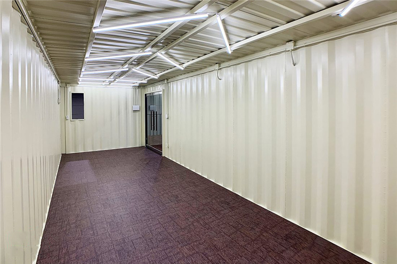 進(jìn)入辦公室室內(nèi),內(nèi)部的飾面材料是在兩層結(jié)構(gòu)膠合板上進(jìn)行的地板裝飾瓷磚飾面,墻面和天花板均進(jìn)行了防銹處理,并使用白色涂料打造整潔的內(nèi)飾面。室內(nèi)配備空調(diào)設(shè)備和高效LED照明設(shè)備。