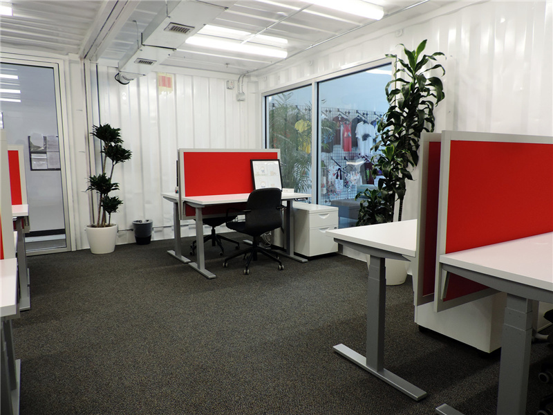 室內是紅色隔板的辦公桌,慣有的簡約格局。由于這個集裝箱辦公室是在室內的,因此并不需要太多的隔熱處理,即使是在辦公室里也能清晰地看到波浪板的紋路。