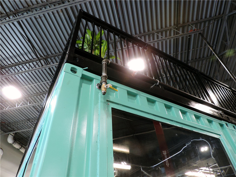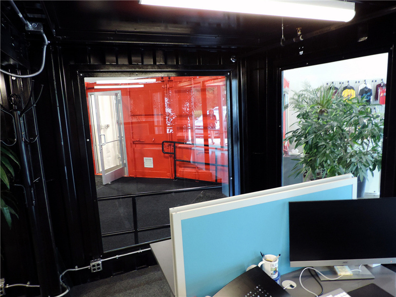 與紅色的集裝箱辦公室不同,這個藍色的集裝箱辦公室的里面采用了黑色的墻面,剛好與白色相對應,給人較為嚴肅的格調。